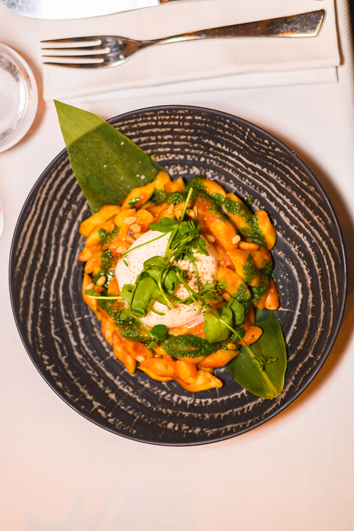 Arrabiata-style gnocchi, burrata, and basil